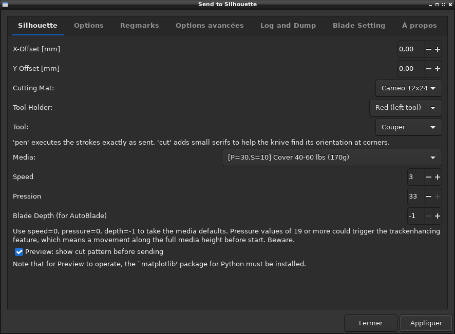 Une fenêtre s'ouvre permettant de configurer les paramètres de découpe/traçage