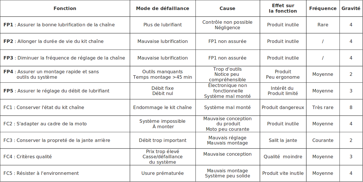 On ne cherche pas ici à réaliser un AMDEC exhaustif mais seulement à se donner une idées de problèmes pouvant arriver pour aider à la conception. Il est indispensable de revenir sur les problèmes d'utilisations après essai du système.