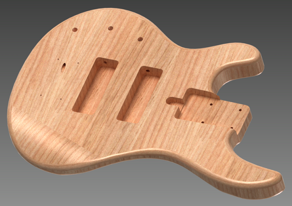 Les usinages de la face incluent 4 poches (évidage à l'intérieur d'un contour fermé) : l'assemblage en queue d'aronde du manche, le dégagement permettant l'accès au Truss Rod, et le logement des 2 micros. L'usinage en marche d'escalier, ébauchant un arrondi sur le côté du corps, termine les opérations de cette face, à la fraise. En effet, j'ai ensuite utilisé un foret de diamètre 2mm pour pointer les perçage a effectuer par la suite.